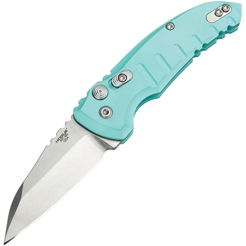 Model/Part Number – HO24103. Hogue Auto A01 Microswitch Button. Automatic opening. 3.88″ (9.86cm) closed. 2.75″ (6.99cm) tumbled finish CPM-154 stainless Wharncliffe blade. Aqua blue anodized aluminum handle. Pocket clip. Manual safety. Boxed. Proundly made here in the USA.