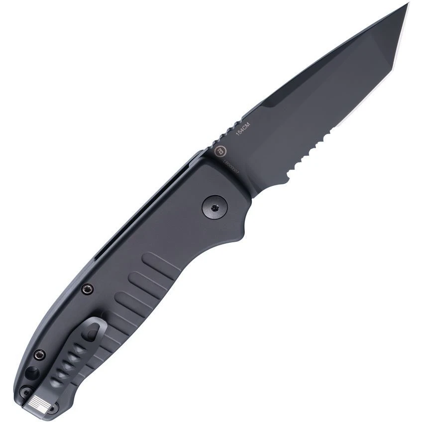 - 3.5″ (8.89cm) black Cerakote finish partially serrated 154CM stainless tanto blade